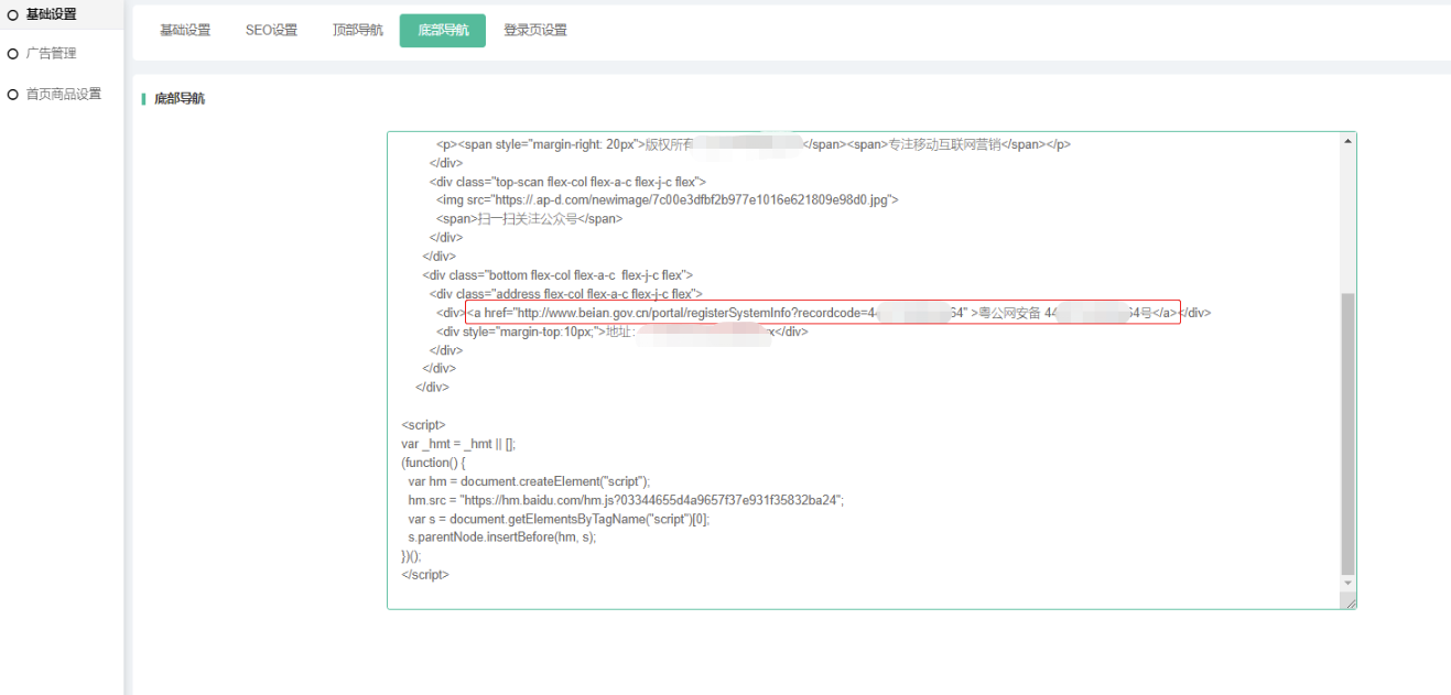 可自定义设置底部导航logo、二维码、导航链接、备案号、公司信息等;