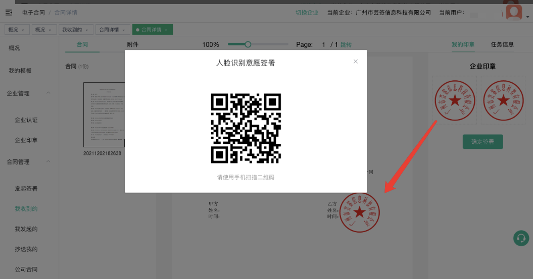 进行意愿认证签署,合同即签署成功,等待对方签署。