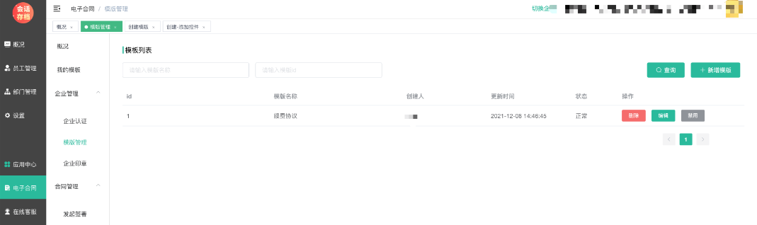 1、在电子合同--企业管理--模板管理中新增模板