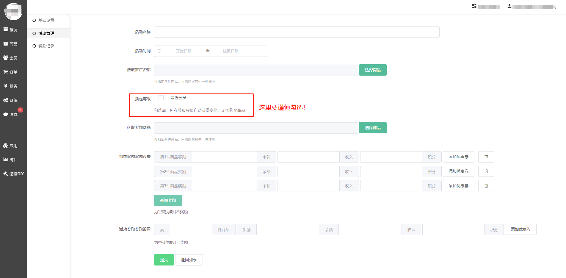 3) 添加奖励商品,可以添加多款商品。在活动期间内,直推下级购买该指定商品,上级会员可以获得奖励。在活动期间内下级可以重复购买商品上级获得奖励。
