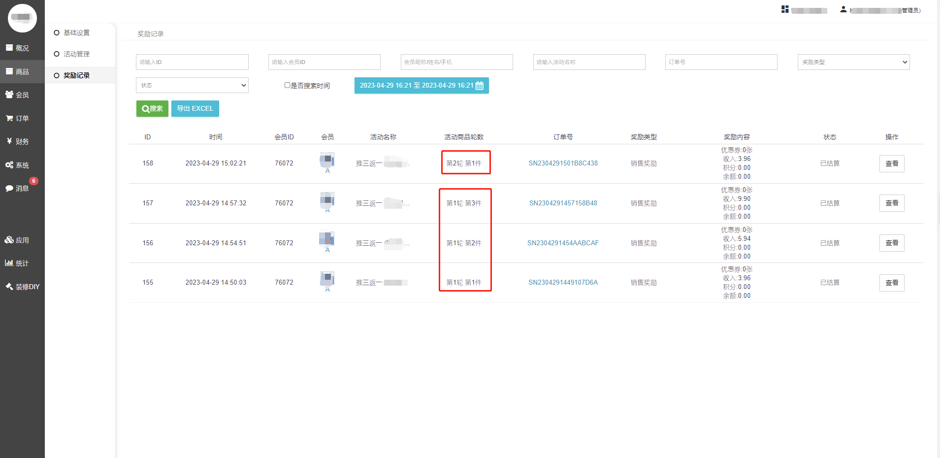 8,同一活动的所有奖励商品都算一轮次,不同活动的算别轮(一个活动内的,都算同一轮)