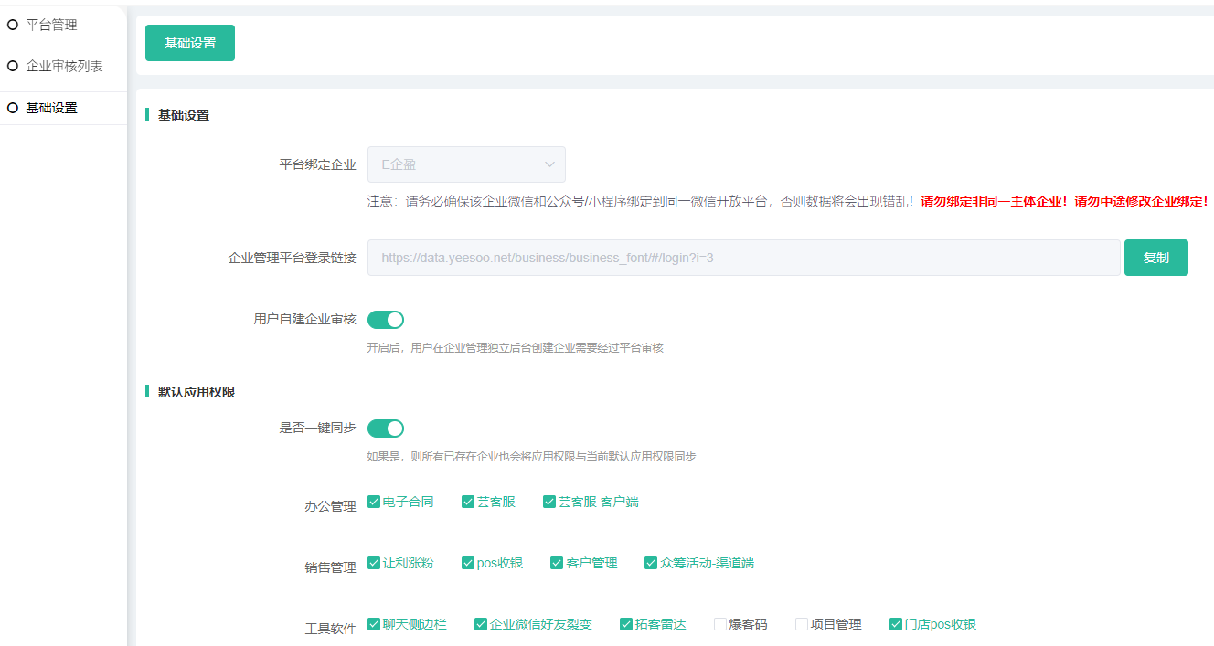 设置默认设置后,在单个企业编辑管理时,可单独设置单个企业的应用权限。