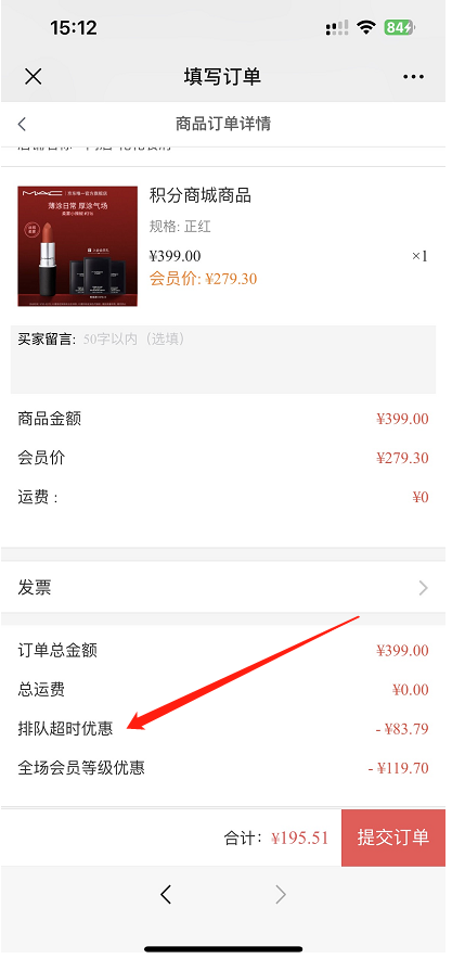 5、扫码点餐,若排队超时了,可享受超时首单折扣,可在提交订单页面查看到(只有从这个页面进入的才可以享受超时首单的优惠)
